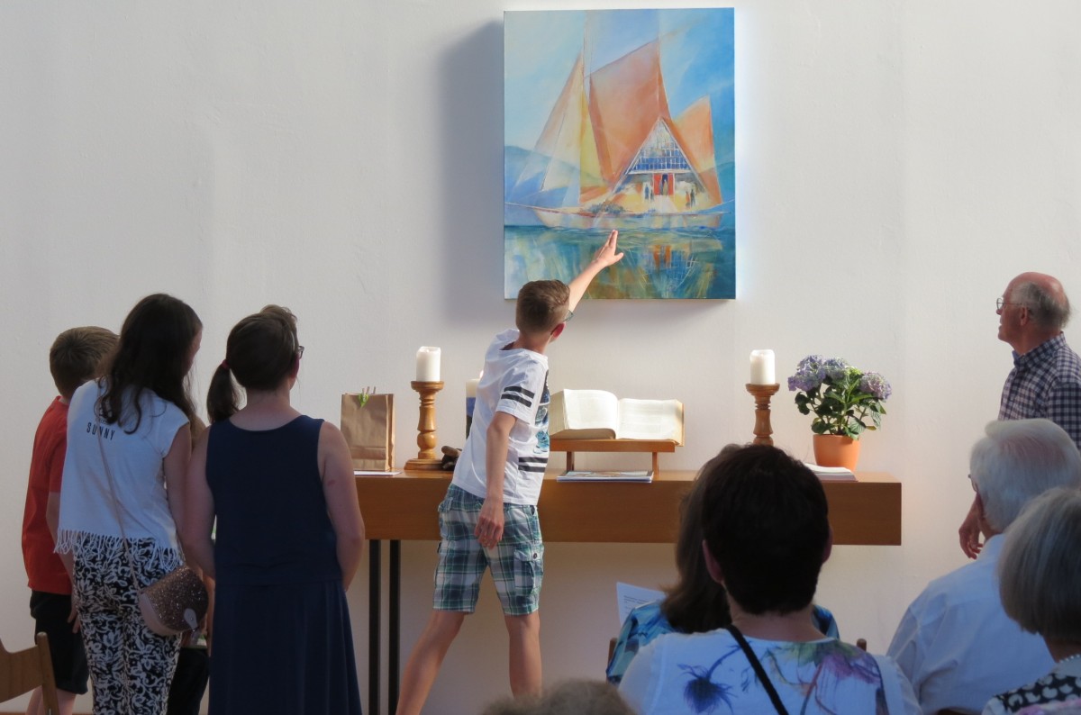 Das Altarbild von Herbert Heß in der Ev. Kirche in Hoppstädten wurde in einem Gottesdienst zusammen mit Kindern und Jugendlichen betrachtet, erläutert und vorgestellt.